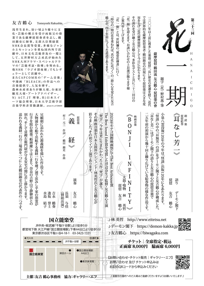 12/16(火)第33回 「花一期」 薩摩琵琶鶴田流友吉鶴心琵琶楽の會 国立能楽堂