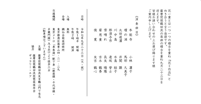 9/23(火)花一重 薩摩琵琶鶴田流友吉鶴心門下生研修の会